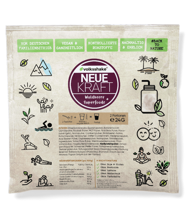 Sestavine: grahove beljakovine v prahu, guarana v prahu, banana v prahu, kvinoja v prahu, baobab v prahu, MCT v prahu, rdeča pesa v prahu, maca (rumena) v prahu, aronija v prahu, brusnica v prahu, aroma jagodičevja, kurkuma v prahu, zgoščevalec: guar gumi, pšenična trava v prahu, kokosova voda v prahu, acai jagode v prahu, goji jagode v prahu, gobe reishi prahu, gobe shitake v prahu, ingver v prahu, yerba mate v prahu, grozdne peške v prahu, chia semena v prahu, šipkove luščine v prahu, ginkgo biloba v prahu, ašvaganda v prahu, črni poper v prahu, lanena semena v prahu, ječmenova trava v prahu, sladilo (steviol glikozidi iz stevije), žive bakterijske kulture, bromelain (encim iz ananasa), papain (encim iz papaje).